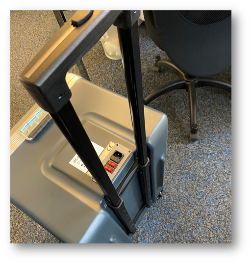 Sollten die Notebooks auch ausserhalb des Koffers geladen werden müssen, so kann man die Netzteile aus dem Koffer ausstecken. Dafür muss die Hauptabdeckung, an beiden Innengriffe, hochgezogen werden.
