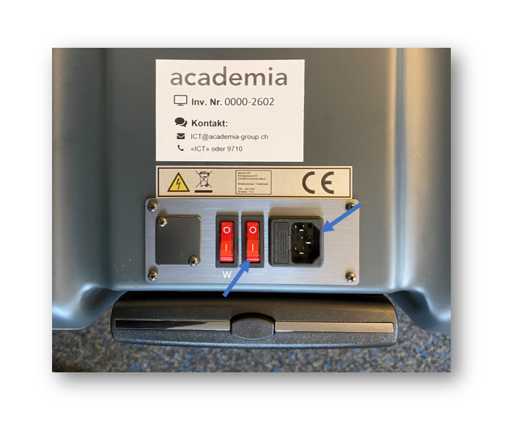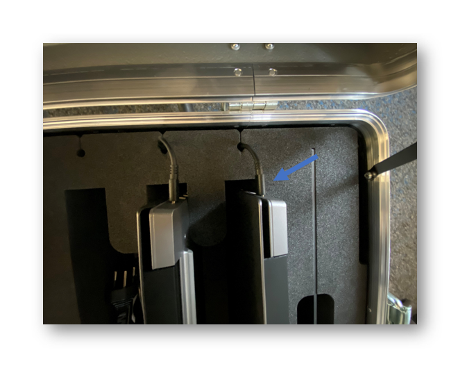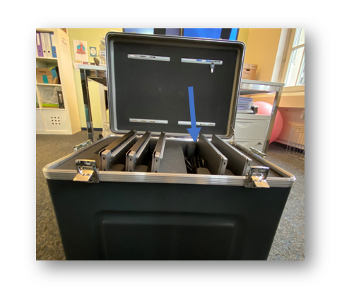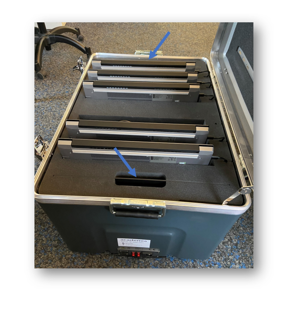 Die Notebooks können im Koffer geladen werden. Dafür muss der Koffer an den Strom angeschlossen und der Power-Button eingeschaltet werden. Die Notebooks müssen im Koffer ebenfalls am Ladekabel eingesteckt sein.