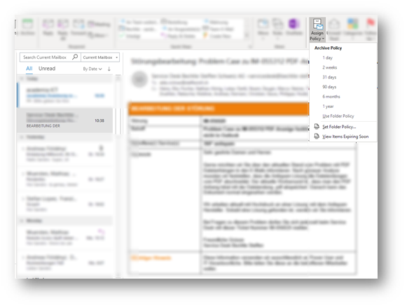Bei Bedarf können auch E-Mails aus dem persönlichen Postfach in das Archiv manuell per drag & drop verschoben werden oder eine andere Richtlinie gesetzt werden. Durch die Zuweisung einer Richtlinie wird das E-Mail früher als die per Standard gesetzten zwei Jahre verschoben.