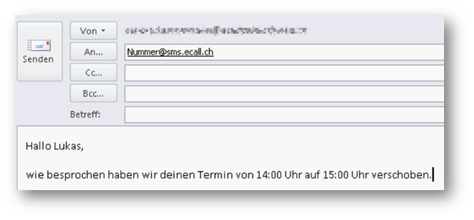 Im An Feld die Mobilenummer eintippen und mit @sms.ecall.ch abschliessen.
